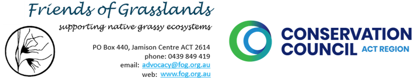 Friends of Grasslands (FOG) is a community group dedicated to the conservation of grassy ecosystems in south-eastern Australia - natural temperate grasslands and grassy woodlands. FOG advocates, educates and advises on matters to do with the conservation of these ecosystems, and carries out surveys and on-ground work. FOG is based in Canberra and its members include professional scientists, landowners, land managers and interested members of the public.
