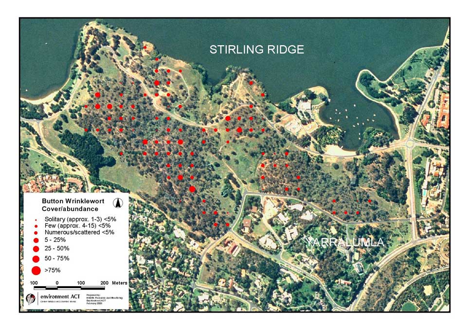 b. A report prepared by Adam Myut for Wildlife Research and Monitoring of Environment ACT in February 2005 (map attached) reports Button Wrinklewort in two locations in quadrats that appear to cross the border of the proposed development envelope.