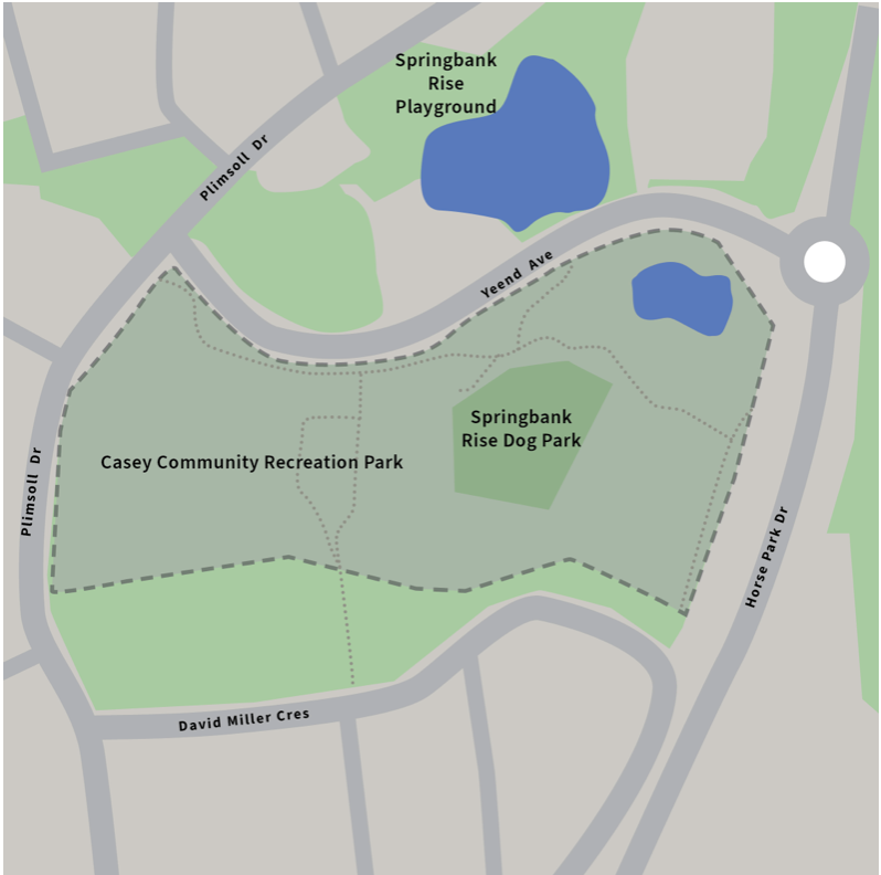 Map 1 shows the location of the Casey Community Recreation Park which is at the western end of the area between Horsepark Drive and Plimsoll Drive. The plan does not indicate what is planned for the area between the southern end of the park and David Miller Crescent. The concept plan fails to place the concept plan area in the boarder context linking native woodlands between those along Horsepark Drive through the Springbank Rise to the Kinlyside woodland.