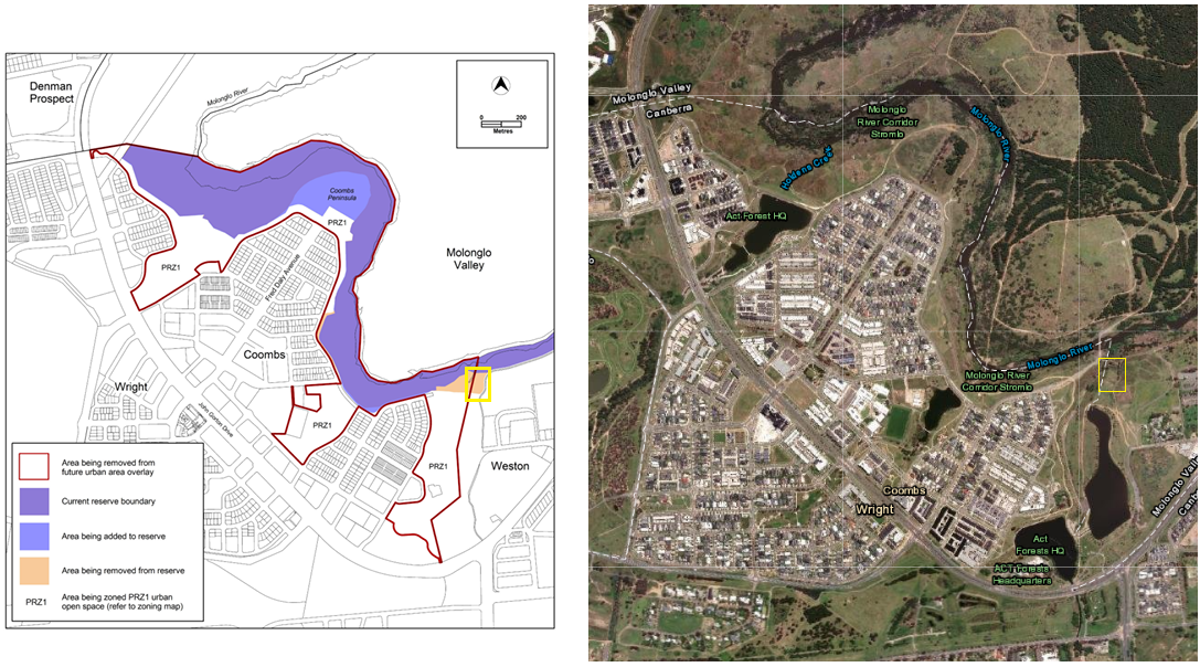 Figure 1: Land to be removed from Molonglo River NR – close to its junction with Weston Creek – including a portion that could, in future, be developed (in the yellow box)
