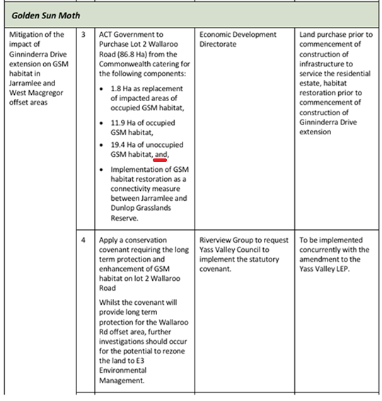 - Nothing in the offset management plan made for Lot 2 mentions anything about the threat posed by developing half of this Golden Sun Moth Conservation Reserve.[3]