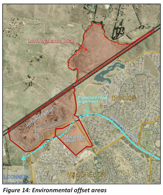 - The term ‘Golden Sun Moth Conservation Reserves’ is defined in the EPBC Act approval (as varied) as “the areas represented in Figure 14 of the Program by the red-shaded polygons labelled “Lot 2 Wallaroo Road”, “Jarramlee offset” and “Macgregor offset”.[17] Figure 14 is reproduced below, it clearly identifies allll 86.8 ha of Lot 2 as an ‘Environmental offset area’.